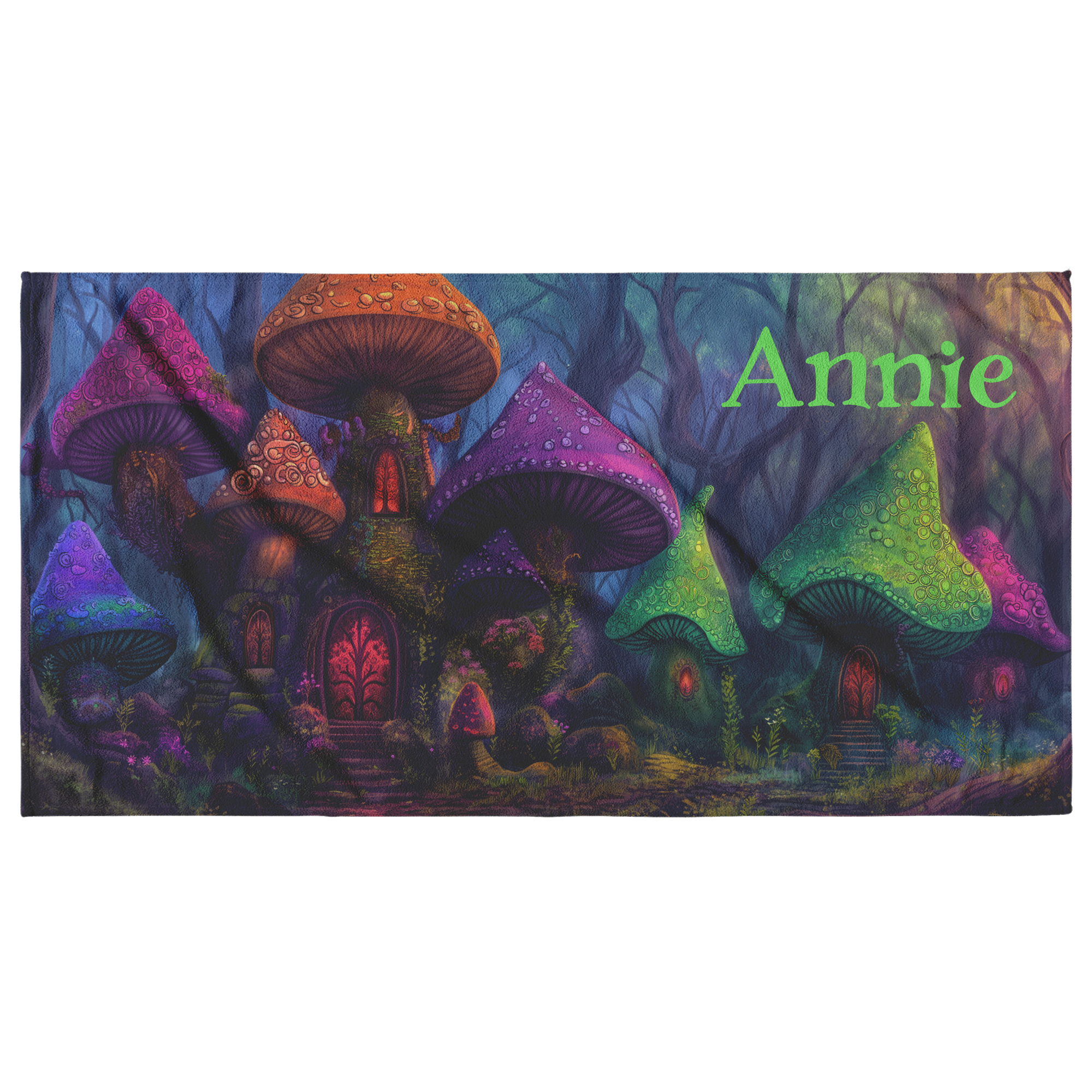 Mushroom Houses Beach Towel – Can be Personalized – Colorful Fantasy Mushroom Dw